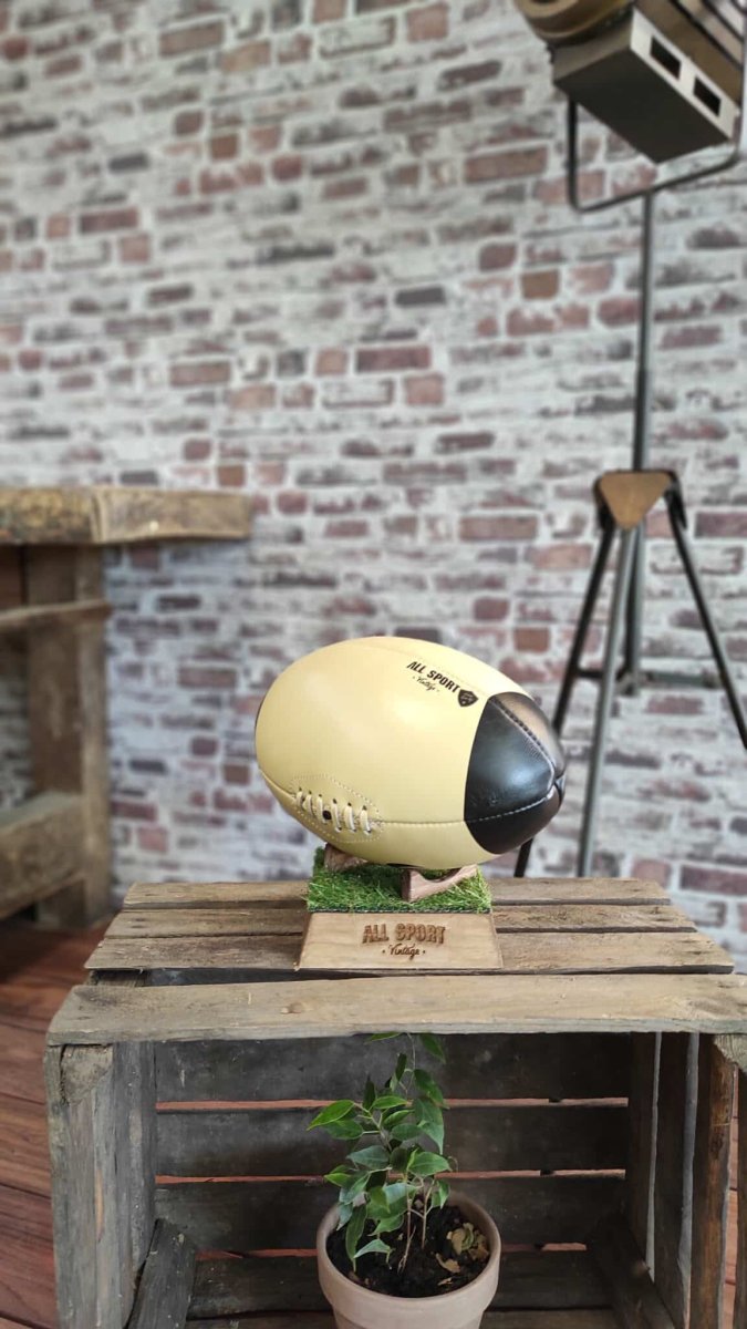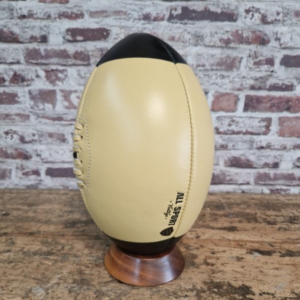 Découvrez l’élégance et la tradition avec ce ballon de rugby en cuir beige, agrémenté de pointes noires pour un contraste saisissant. Conçu pour les amateurs de rugby et les collectionneurs, ce ballon incarne la qualité et le style des années passées.