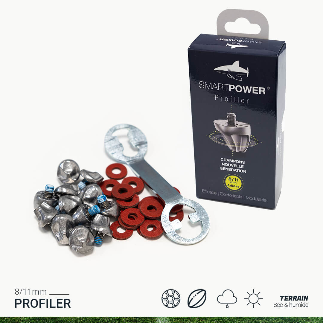 La performance se joue à quelques millimètres. Tente, ose et fait la différence sur terrain gras grâce à notre crampon nouvelle génération en aluminium. Profite d’une adhérence exceptionnelle et de sensations renforcées grâce à leur forme profilée qui te procure cet « effet griffe ». Enfin, adapte ta configuration à ton feeling et ton style de jeu. 8 crampons 8mm + 4 crampons 11mm pour chaussures Adidas* + 20 rondelles de réglage + 1 clé de réglage. *Uniquement pour chaussures Adidas 6 crampons (sauf Kaiser & Copa ancienne génération).