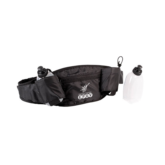 Ceinture porte bidon pour course à pied en polyester, enduction PU. Dos matelassé en filet respirant, poche principale zippée, 2 poches latérales porte bidon, support élastiqué porte veste de running / barre energétique. Livrée avec deux bidons de 30 cl, fermeture réglable par bande auto-agrippante.