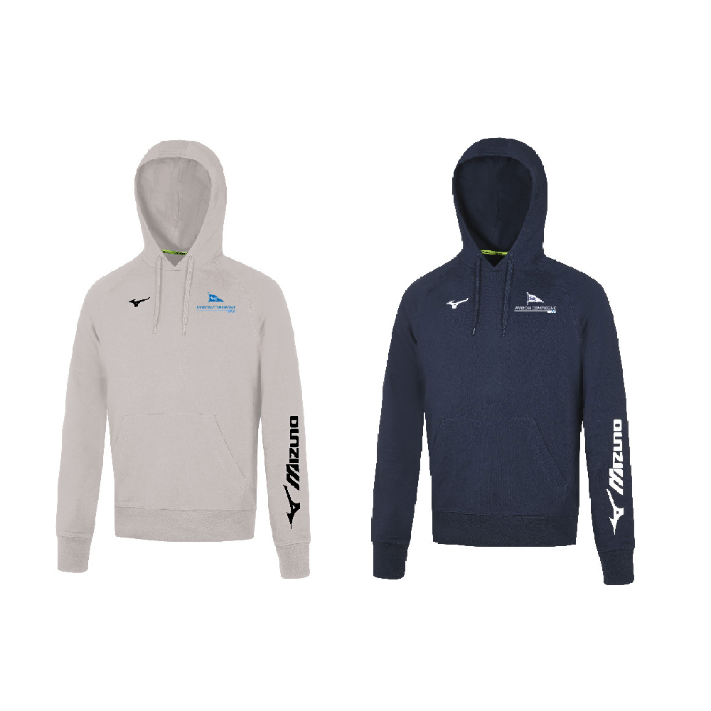 Sweat capuche marine MIZUNO avec poche kangourou. Logo Mizuno sur l‘avant bras et logo club en broderie.