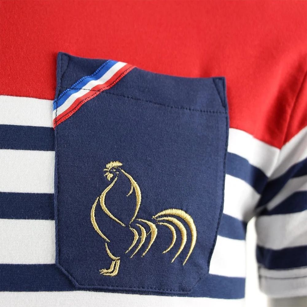 L’authenticité et le prestige de cette marinière sont rehaussés par une délicate broderie représentant un coq en fil doré qui orne la poche, symbolisant à merveille la fierté et l’excellence française. Un rappel subtil du drapeau bleu, blanc, rouge vient parfaire cette composition pour un résultat d’une élégance indéniable.