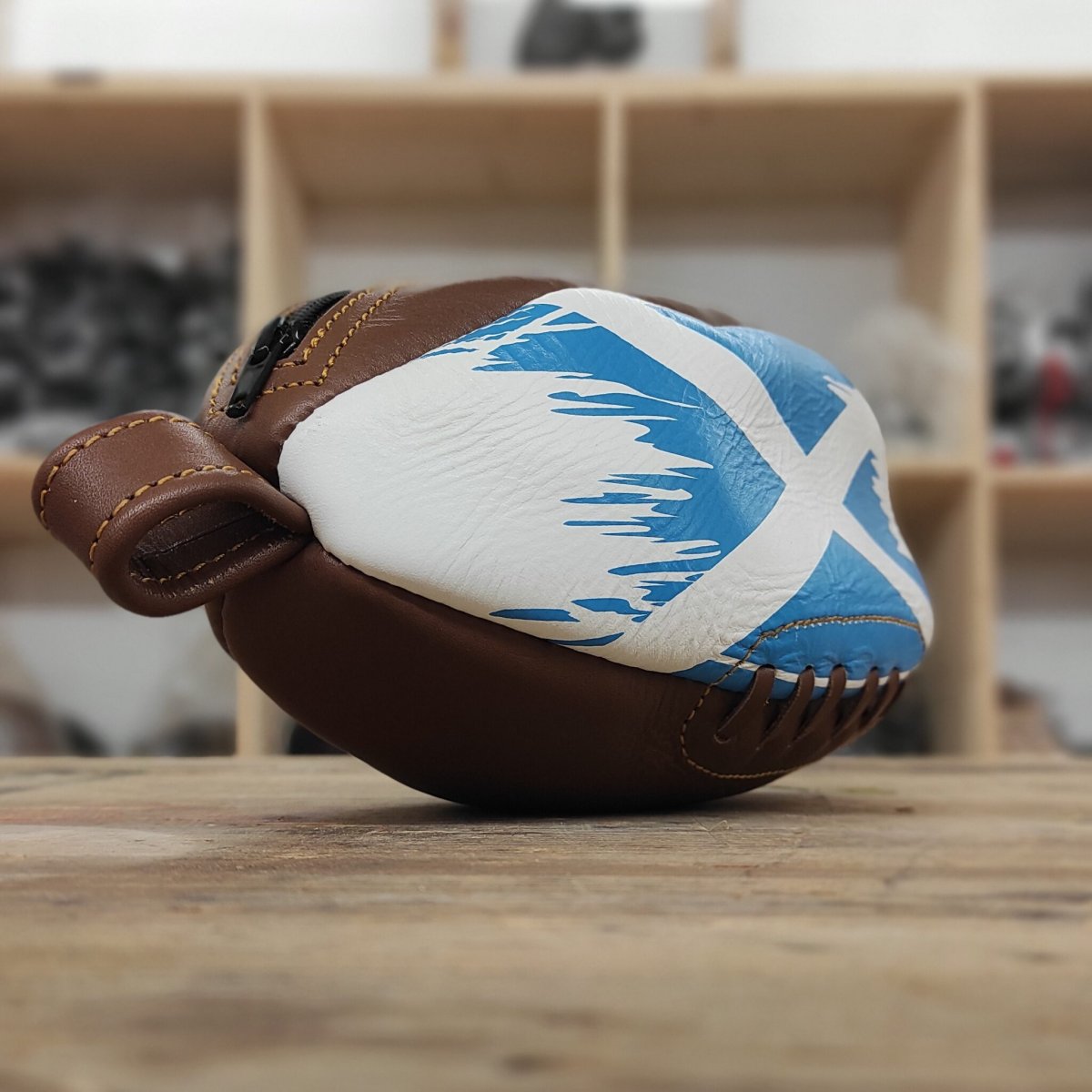 trousse de toilette en cuir e en forme de ballon de rugby aux couleurs de l’Ecosse